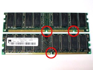 位于上面的那片内存条就是我们现在使用的SDRAM,而下面一片就是大家只闻其名未谋其面的DDRAM内存条。从外观上,DDRAM内存条区别于SDRAM明显的特点是:DDRAM内存条的金手指部分只有一个缺口(已用红圈标注),而SDRAM内存条则有两个缺口。    另外,从外观上,我们还能比较出:DDRAM内存条的金手指比SDRAM多。确实,DDR是184 PIN的,而现在的SDRAM内存条是168 PIN的。    下面就是DDR内存条的放大图:
